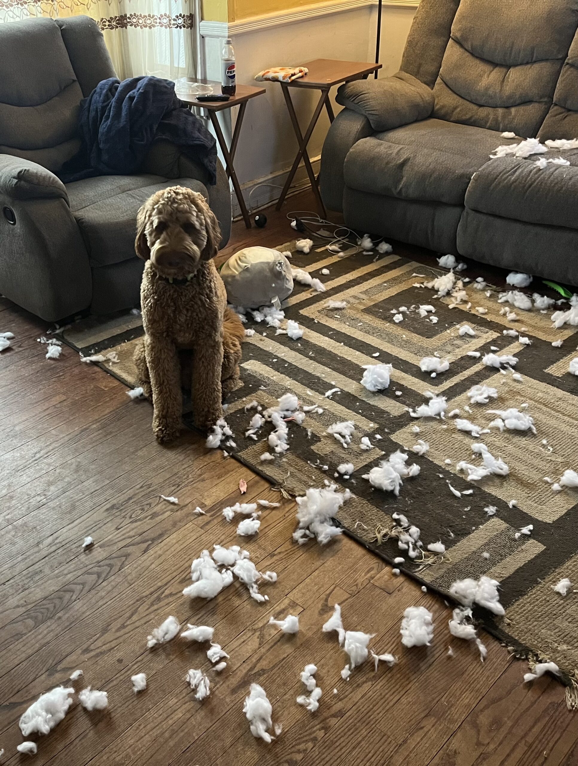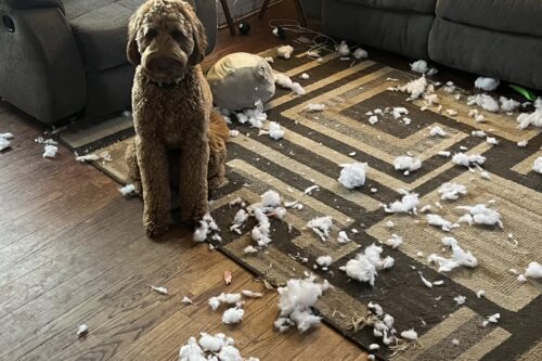 Killian, sheepadoodle service dog, in training.